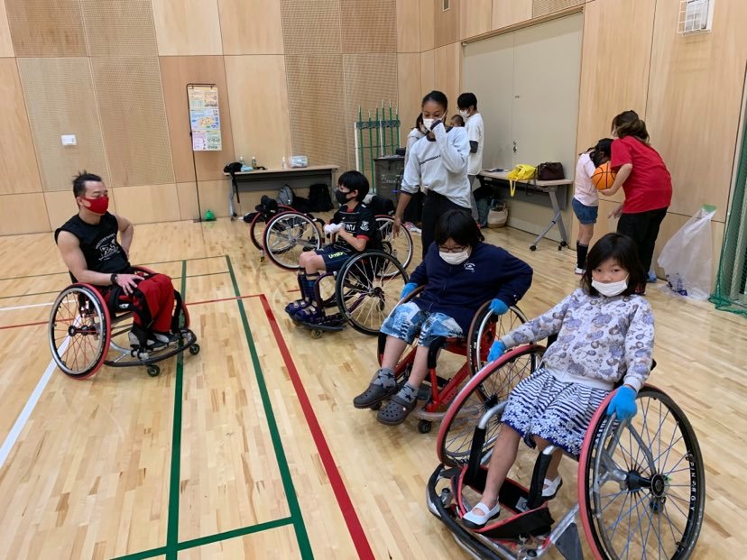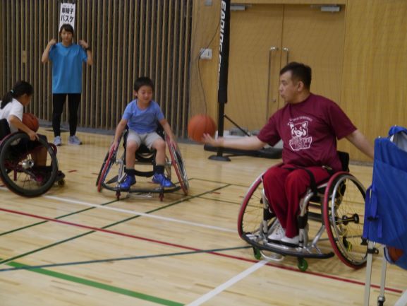 川崎WSCの現役選手達と一緒に車いすを上手に操って車いすバスケに挑戦!!