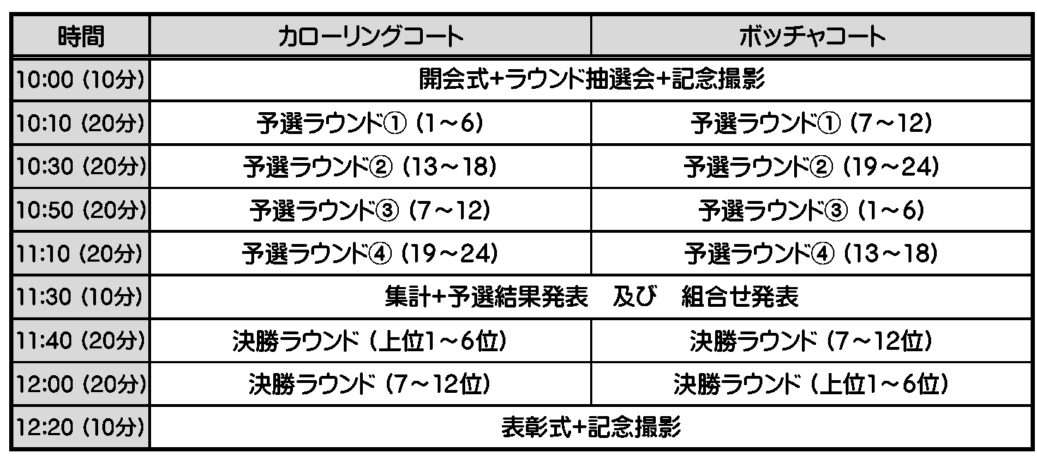 - ①カローリング(4イニング)とボッチャ(4ピリオド)の合計点で勝敗、順位を決定します。