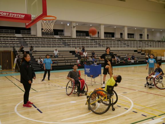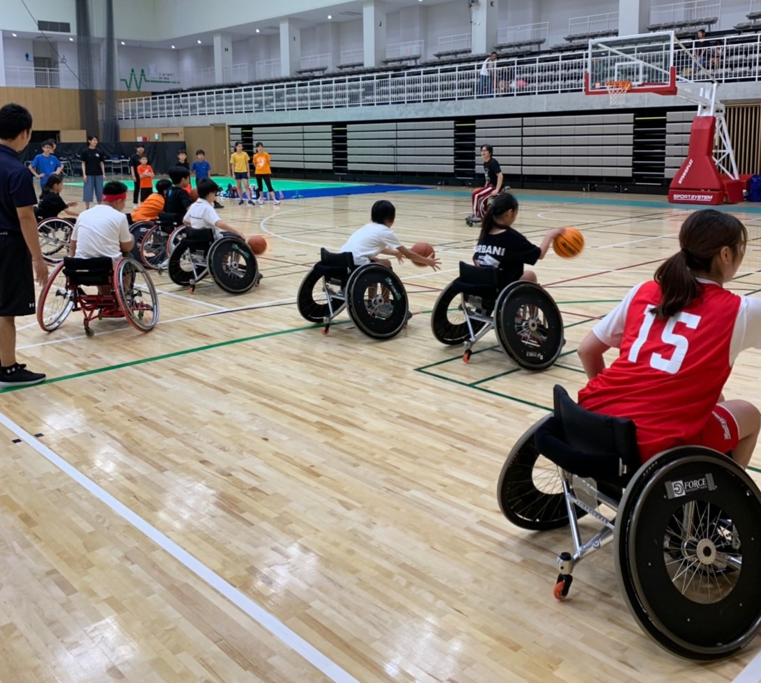 午前中に行われた「バスケ&車椅子バスケ教室」の様子です。