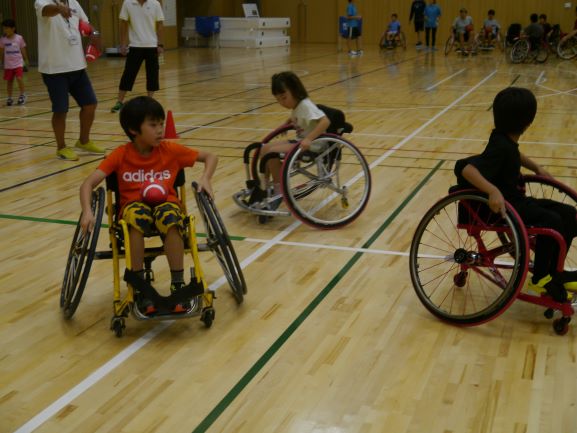 川崎WSCの現役選手達と一緒に車いすを上手に操って車いすバスケに挑戦!!
